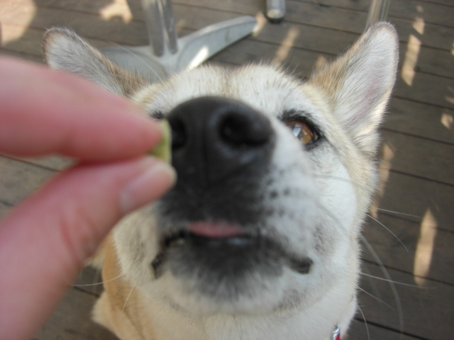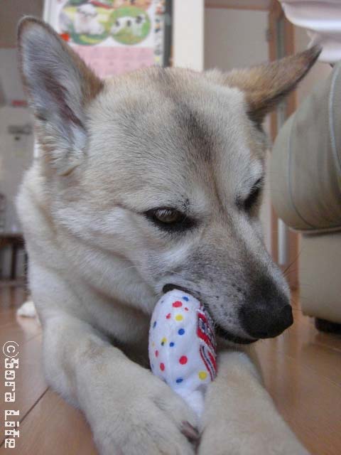 勿論チーズなのでそらのお鼻もいち早く反応しニュ~~っとお鼻が伸びてきましたがこれはさすがにね~(汗)ということでそら用チーズでガマンしてもらい、イヂイヂとこれまた十兵衛さんからの頂き物の飴ちゃんオモチャで憂さ晴らし(笑)