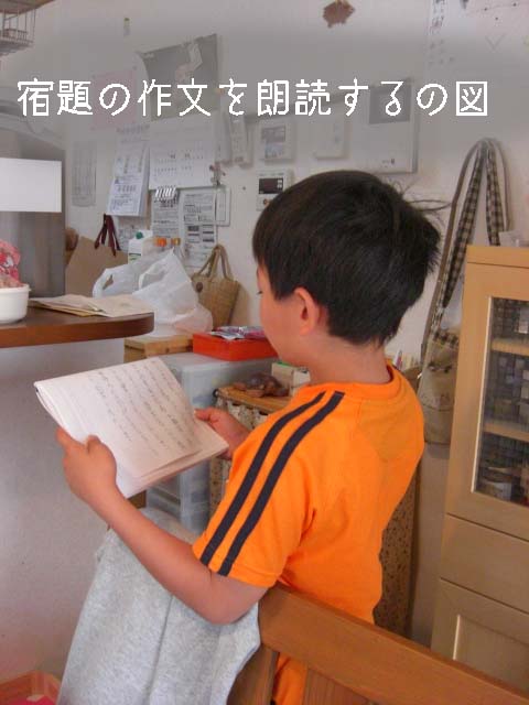 朝ごはんの支度をしている間にちけぽはGW中に出された宿題の作文を書き、ママに朗読中。