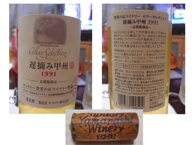で、この間の強化合宿にて買ってきた白ワイン「登美の丘ワイナリー 甲州遅摘み 1991 長期瓶熟品」を飲みながら美味しく頂きました。