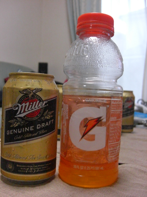 完全に日本向けではないオール英語表記のミラービールにゲータレード(オレンジ味)