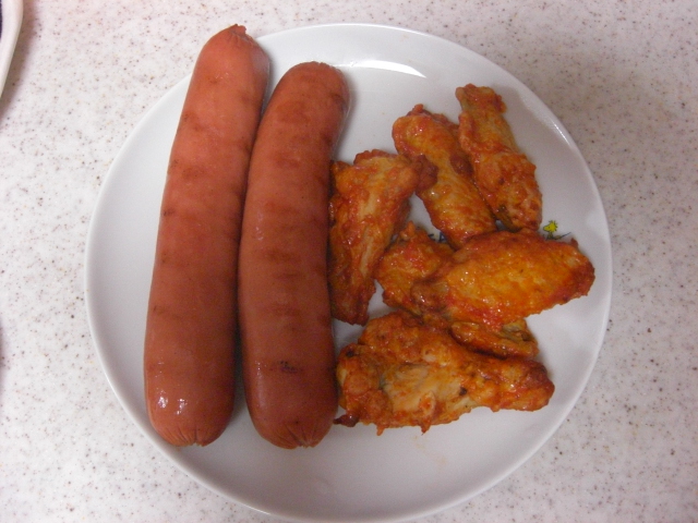 多分ホットドッグ用のデカイソーセージ(味濃かった~)・ピリっと辛口チリ手羽(この量で100円と投売りしてました)