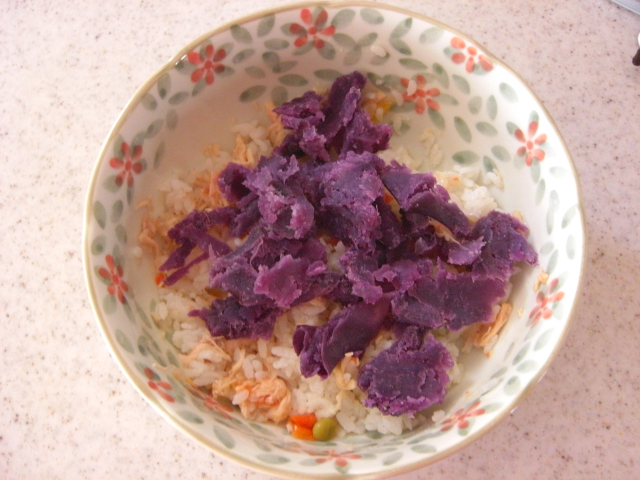 白米・イナバのレトルト(鶏ささみ)・紅芋をレンジでチンしたもの。