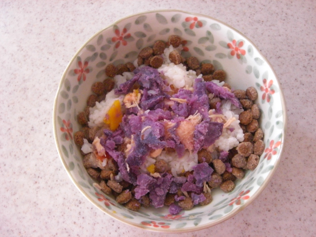 昨日のものと殆ど同じなのですが、白米を半分にしドライフードをふやかしたものを少し加えてみました。