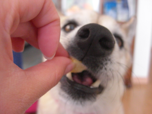 ホントはまだオヤツはあげたくなかったけどこうでもしないとカメラのほうを向かないので仕方なく1つ。