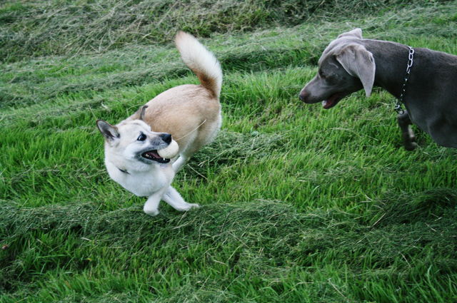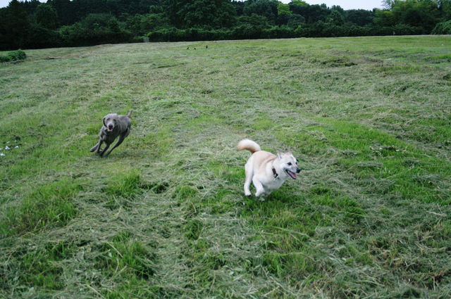 最初は2ワンでわらわら楽しそうに走ってたけど、そらは「放牧=ボール」と勘違いしてる所があるので催促されました(笑)