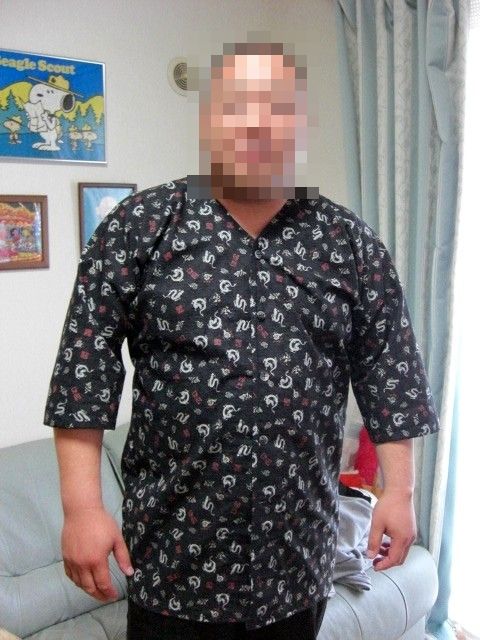 このアンバランスな体系なので身頃の丈は3Lでも丁度良いんだけど、袖丈はMくらいにしました。(腕みじかっ!)