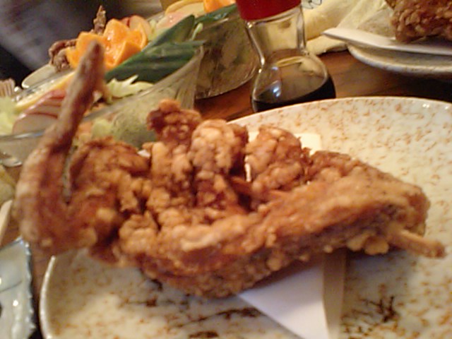 このデカイ鳥と刺身盛り・サラダ(結構デカイのに1人1個)・寿司が出てきて3000円。飲み代は別だったけど安くあがったし美味しかったので何よりでしたね~。