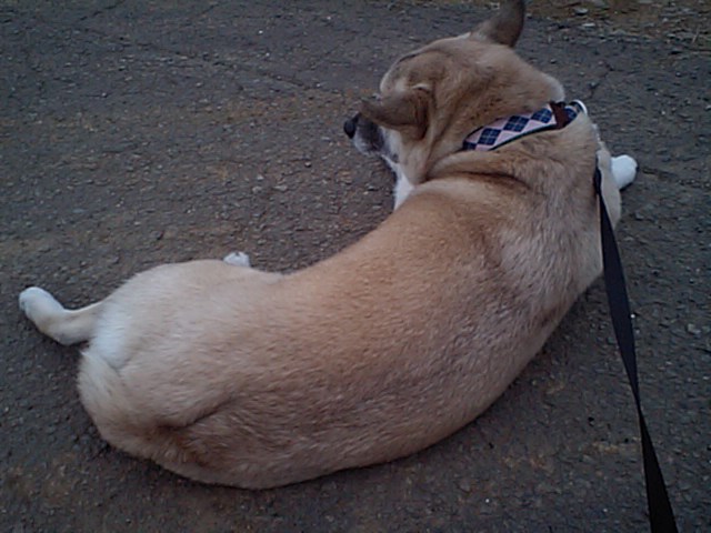 様子を見ていたら草を食べていたので胃の調子でも悪いんだろうな・・・とは思うんだけど、20分くらい歩いて家に戻る途中で耳と尻尾を下げて情けない顔をして座り込むこと数回。