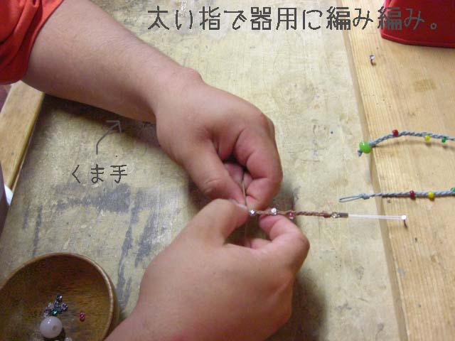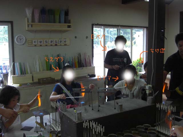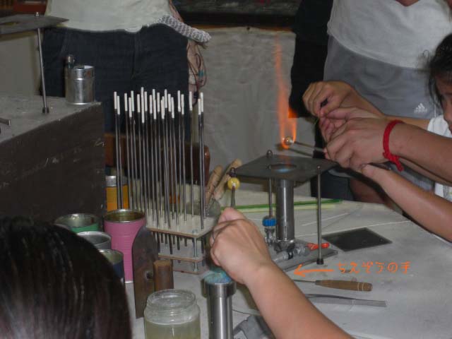 右手でとんぼ玉の素のガラスを溶かしつつ、左手ではそれを巻きつける棒を熱する・・・という難儀な内容。