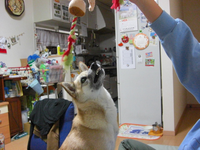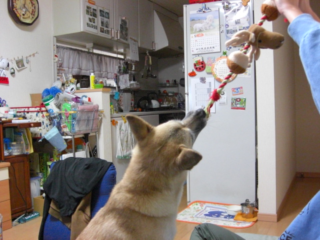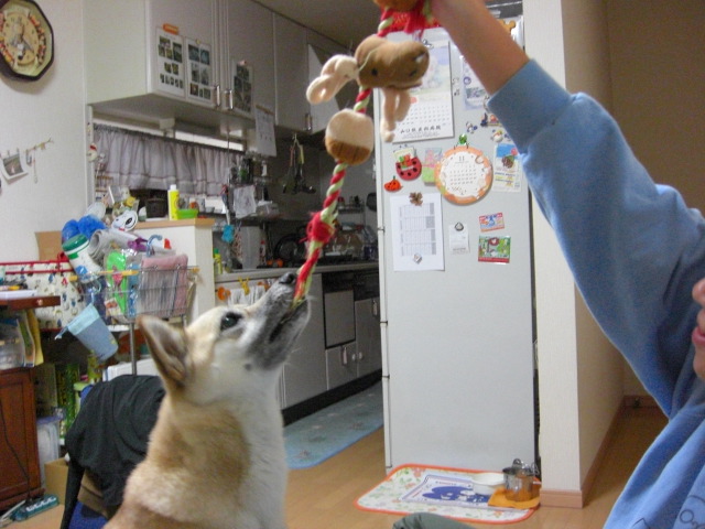 最初は大好きなボール類を片付けられ「えぇ~~!」というような顔をしていたけど数日経つとそんなことも忘れたのかロープのオモチャで遊んでます。