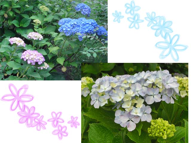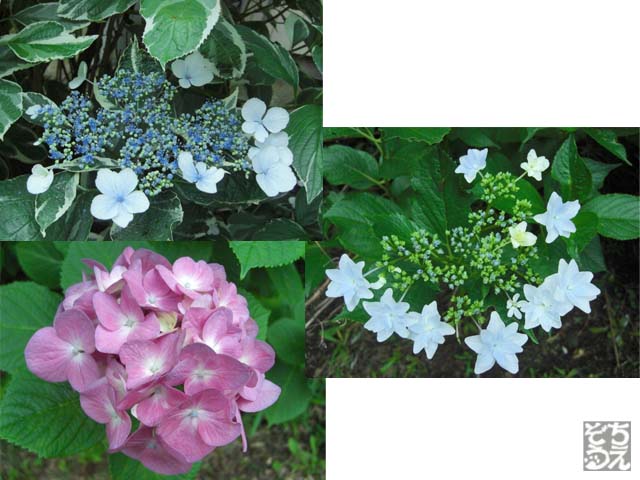 紫陽花の色は「酸性土壌で青,アルカリ性土壌で赤」と言われているのだけれど、左上の紫陽花はこんなに近いのに土壌が違うってことになるのよね。何だか不思議だわ~。