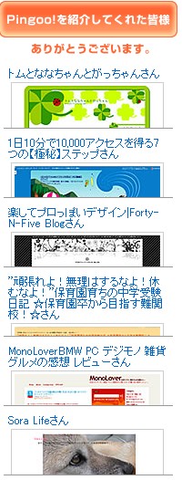 話はガラっと変わりますが、先日「ちょっとCM(?)」にてCMしたpingoo!というサイトで相互紹介があり、ウチのサイトが載りました!!